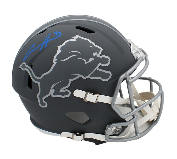 A Detroit Lions Speed Replica Slate NFL Helmet hand signed by Aidan Hutchinson. The item and signature are in excellent condition. Aidan Hutchinson is a defensive player for the Detroit Lions. Aidan has won many awards like the Ted Hendricks Award, Lombardi Award and the Lott Trophy. AUTHENTICATION: The item is accompanied by a Beckett Serial Numbered and Databased Hologram