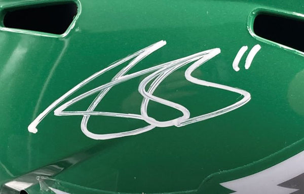 Featured is an AJ Brown signed Philadelphia Eagles full size replica speed helmet. This helmet has been hand signed by Brown and comes with the Beckett hologram and certificate of authenticity. Included with this helmet is a Super Bowl 59 deluxe acrylic display case. This helmet would make a great addition to any sports memorabilia collection!. SPECIFICATIONS Autographed By: AJ Brown Team: Philadelphia Eagles Sport: Football Authentication: Beckett Grading Services