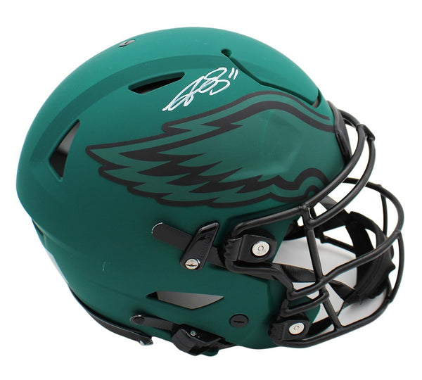 A Philadelphia Eagles Speed Flex Authentic Rave NFL Helmet hand signed by AJ Brown. The item and signature are in excellent condition. AJ is wide receiver for the Philadelphia Eagles. He was drafted into the NFL in 2019 by the Tennessee Titans. He played college football for Ole Miss. AUTHENTICATION: The item is accompanied by a Beckett Serial Numbered and Databased Hologram.