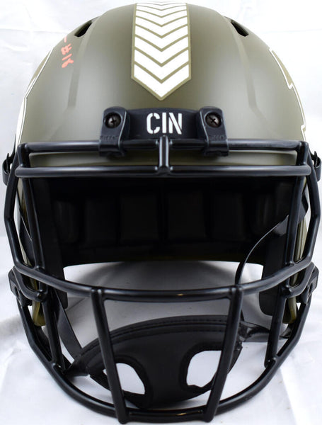 AJ Green Autographed Cincinnati Bengals F/S Salute to Service Speed Helmet-Beckett W Hologram *Orange This is an AJ Green of the Cincinnati Bengals hand autographed Riddell Football Full Size Salute to Service Speed Replica Helmet. This item has a Beckett Witnessed Authentication, which comes with a numbered hologram and a QR code for verification. You can view this item on the Beckett website and it shows when and where the item was signed. It was signed either at a public autograph appearance or a private signing. This is a stock photo of the item. Although you may not receive this exact item, the item you receive is virtually identical, brand new, and in great shape.