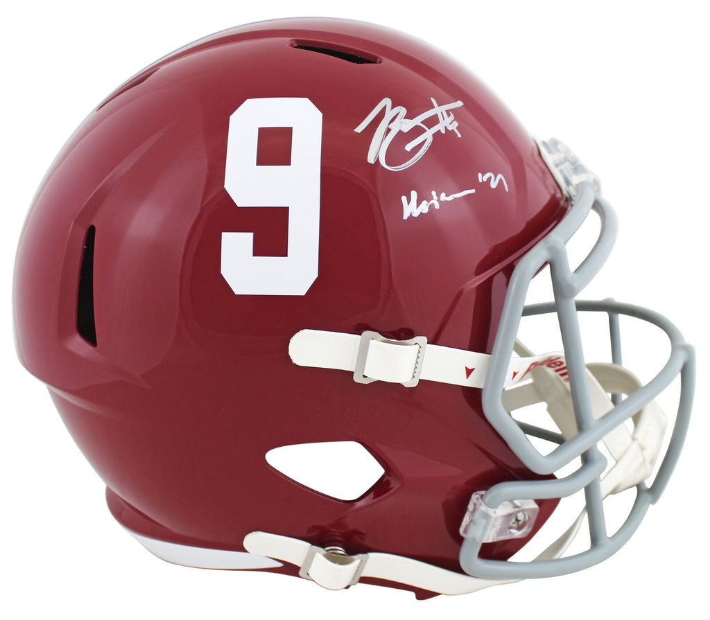 This Autographed w/ Silver Signature Full Size Speed Rep Helmet with the inscription of "Heisman 21" has been Personally Signed by Bryce Young of the Alabama Crimson Tide. This item is 100% Authentic to include a hologram by Beckett Authentication Services. This item will come with the new Beckett Authentication hologram that has a scannable QR code rather than the traditional COA. If you would like to have a COA, you are welcome to reach out to Beckett for a printed certification once you receive your item. This is a BAS Witnessed Protection Program item which means a Beckett Authentication Service representative was present when this item was being signed. We conducted an autograph signing with Bryce Young where multiples of the same item were signed. While the photographs are representative of this item, the size, placement and strength of the signature may vary. Each item is hand signed, therefore, each autograph is unique. This item can be verified through BAS Witnessed.