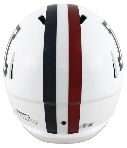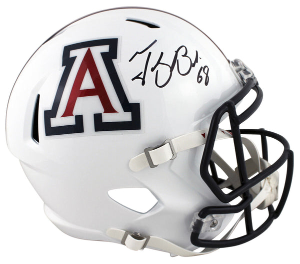 This Autographed White Full Size Speed Rep Helmet has been Personally Signed by Tedy Bruschi of the Arizona Wildcats. This item is 100% Authentic to include a hologram by Beckett Authentication Services. This item will come with an affixed Beckett Authentication Services (BAS) authentication sticker, which includes a scannable QR code to verify authenticity. Please note that Beckett no longer provides serial-numbered COA cards, and the attached BAS sticker will serve as the complete authentication for this item. This is a BAS Witnessed Protection Program item which means a Beckett Authentication Service representative was present when this item was being signed. We conducted an autograph signing with Tedy Bruschi where multiples of the same item were signed. While the photographs are representative of this item, the size, placement and strength of the signature may vary. Each item is hand signed, therefore, each autograph is unique. This item can be verified through BAS Witnessed.