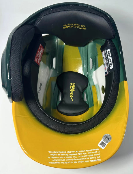 A hand signed Full Size Rawlings Replica Helmet of Oakland Athletics Legend MARK McGWIRE. The signature is in Black paint pen with the inscriptions "87 AL ROY & '89 WS Champs". This item was signed at a private signing with us. This would make a great addition to any CARDINALS collection! This item is guaranteed to be 100% authentic and will include a COA hologram from Beckett Authentication.