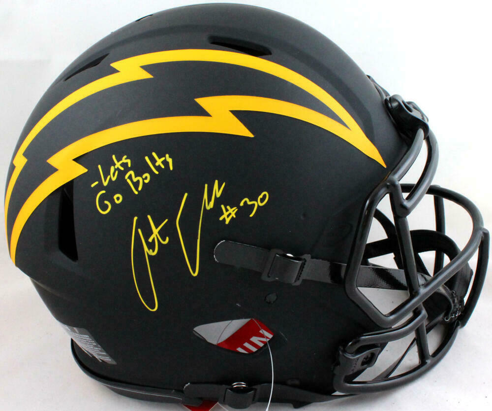 Austin Ekeler Autographed Chargers Authentic Eclipse F/S Helmet w/ Insc- Beckett W *Yellow This is an Austin Ekeler of the Los Angeles Chargers hand autographed Riddell Football Full Size Eclipse Speed Authentic Helmet inscribed with Let's Go Bolts. This item has a Beckett Witnessed Authentication, which comes with a numbered and a matching Beckett Certificate of Authenticity. You can view this item on the Beckett Authentication website, it shows when and where the item was signed. It was signed either at a public autograph appearance or a private signing. This is a stock photo of the item. Although you may not receive this exact item, the item you receive is virtually identical, brand new, and in great shape.