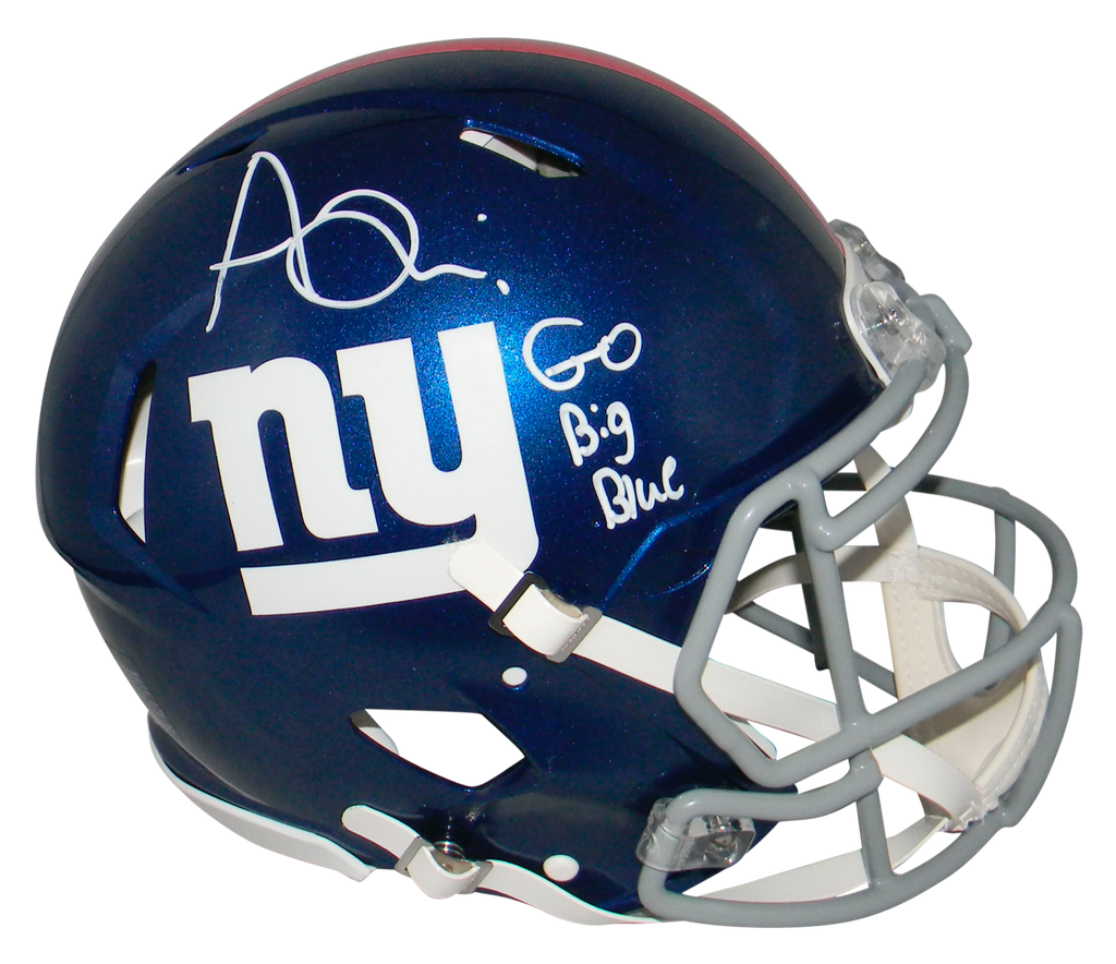 Azeez Ojulari, star linebacker for the New York Giants, has hand signed this Giants Riddell Speed full-size authentic helmet at a private signing. He included the inscription "Go Big Blue". This helmet is fully padded inside like the ones worn on the field. This item is authenticated by Beckett Authentication Services, one of the best authenticators in the industry. Their tamper-evident hologram featuring a QR code and serial number is on the item. The authenticity can be verified online by entering the serial number or scanning the QR code.Item pictured may not be the exact item you will receive. It will be similar quality, and we guarantee your satisfaction.