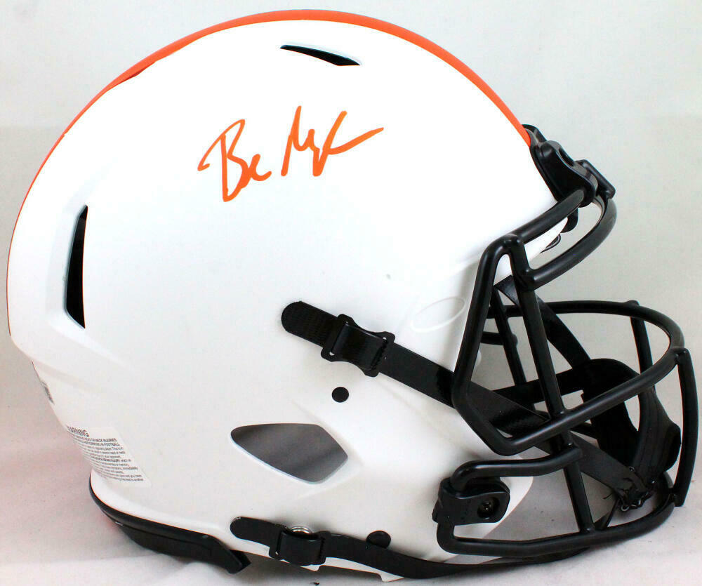 Baker Mayfield Autographed Browns Lunar F/S Authentic Helmet - Beckett W *Orange This is a Baker Mayfield of the Cleveland Browns hand autographed Riddell Football Full Size Lunar Speed Authentic Helmet. This item has a Beckett Witnessed Authentication, which comes with a numbered and a matching Beckett Certificate of Authenticity. You can view this item on the Beckett Authentication website and it shows when and where the item was signed. It was signed either at a public autograph appearance or a private signing. This is a stock photo of the item. Although you may not receive this exact item, the item you receive is virtually identical, brand new, and in great shape.