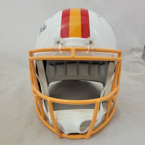 BAKER MAYFIELD AUTOGRAPHED TAMPA BAY HELMET FULL SIZE THROWBACK SPEED REPLICA HELMETBECKETT WITNESSED QR COATHIS MEANS THE HELMET WAS SIGNED WITH A BECKETT REPRESENTATIVE PRESENT SO YOU CAN BE 100% CERTAIN ITS THE REAL THING.