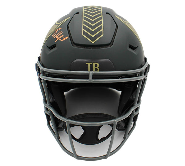 A Tampa Bay Buccaneers Speed Flex Authentic Salute to Service 4 NFL Helmet hand signed by Baker Mayfield. The item and signature are in excellent condition. Baker was drafted into the NFL in 2018 round 1. Baker was PFWA ALL-Rookie Team, PFWA Rookie of the Year (2018), a Heisman Trophy, Maxwell Award, Walter Camp Award and the Davey O'Brien Award winner. AUTHENTICATION: This item is accompanied by a Beckett Serial Numbered and Databased Hologram