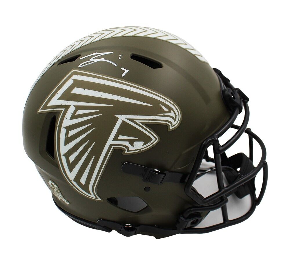 An Atlanta Falcons Speed Authentic Salute to Service NFL Helmet hand signed by Bijan Robinson. The item and signature are in excellent condition. Bijan is a football running back for the Atlanta Falcons. He played college football for the Texas Longhorns. AUTHENTICATION: Your item is tagged with a SmarTag Powered by Prova Technology, which gives you digital access to your items authentication records, including a proof picture from the signing.