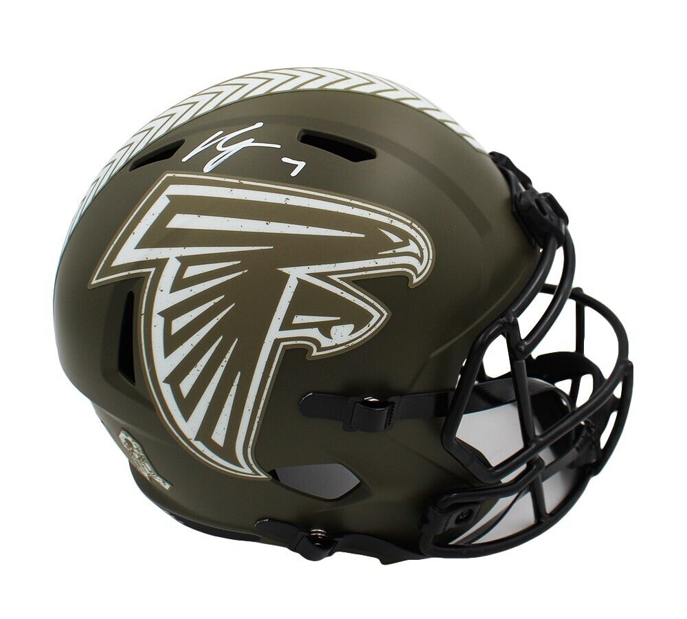 An Atlanta Falcons Speed Replica Salute to Service NFL Helmet hand signed by Bijan Robinson. The item and signature are in excellent condition. Bijan is a football running back for the Atlanta Falcons. He played college football for the Texas Longhorns. AUTHENTICATION: Your item is tagged with a SmarTag Powered by Prova Technology, which gives you digital access to your items authentication records, including a proof picture from the signing.
