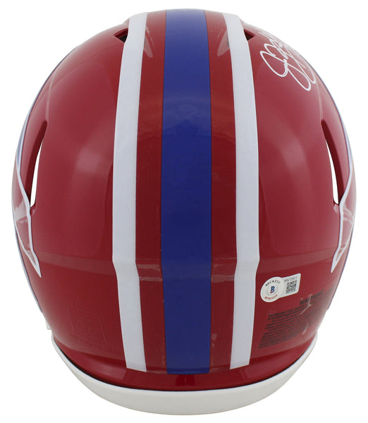 This Autographed 1987-01 Red Throwback Authentic Full Size Speed Proline Helmet with the inscription of "HOF 2002" has been Personally Signed by Jim Kelly of the Buffalo Bills. This item is 100% Authentic to include a Certificate of Authenticity (COA) / hologram by Beckett Authentication Services. This is a BAS Witnessed Protection Program item which means a Beckett Authentication Service representative was present when this item was being signed. We conducted an autograph signing with Jim Kelly where multiples of the same item were signed. While the photographs are representative of this item, the size, placement and strength of the signature may vary. Each item is hand signed, therefore, each autograph is unique. This item can be verified through BAS Witnessed.