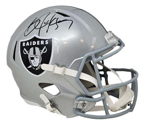 Featured is a Bo Jackson signed Oakland Raiders full size speed replica helmet. This helmet has been hand signed by Jackson and comes with the Beckett witnessed hologram and certificate of authenticity. This helmet would make a great addition to any sports memorabilia collection! SPECIFICATIONS Autographed By: Bo Jackson Team: Oakland Raiders Sport: Football Authentication: Beckett Grading Services