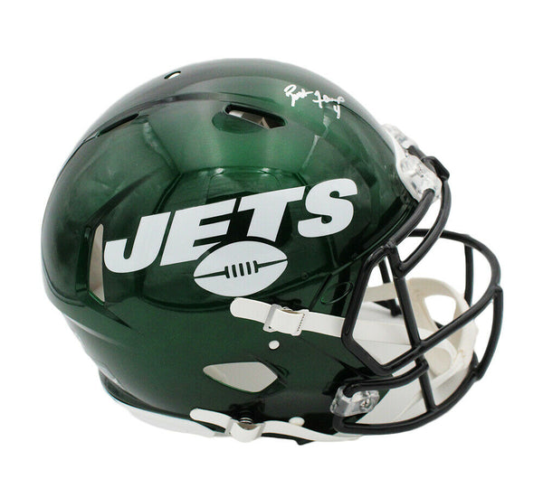 A New York Jets Speed Authentic Green NFL Helmet hand signed by Brett Favre. The item and signature are in excellent condition. Brett is one of the most iconic players in NFL history. A 20 year veteran of the NFL, Brett is a Super Bowl Champion, 11x Pro Bowler, 3x AP NFL Most Valuable Player, 4x NFL passing touchdowns leader, and 2x passing yards leader. His number, 4, has been retired by both the Green Bay Packers and the Southern Miss Golden Eagles. Brett was inducted into the Pro Football Hall of Fame in 2016. AUTHENTICATION: The item is accompanied by a Brett Favre Exclusive Certificate of Authenticity - Brett Favre Exclusive Serial Numbered and Databased Hologram - Picture of Brett from the signing