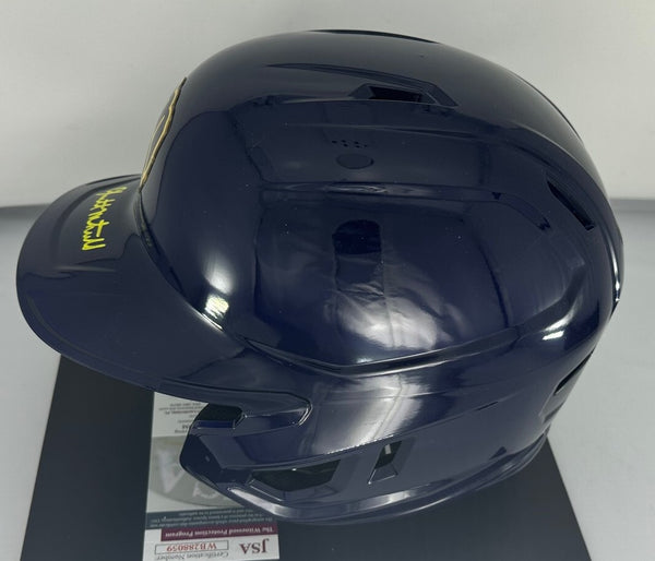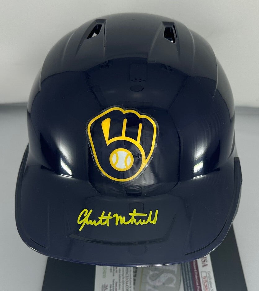A hand signed Full Size Rawlings Replica Helmet of Milwaukee Brewers Outfielder GARRETT MITCHELL. The signature is in Yellow paint pen. This item was signed at a private signing with us. This would make a great addition to any BREWERS collection! This item is guaranteed to be 100% authentic and will include a COA from JSA authentication.