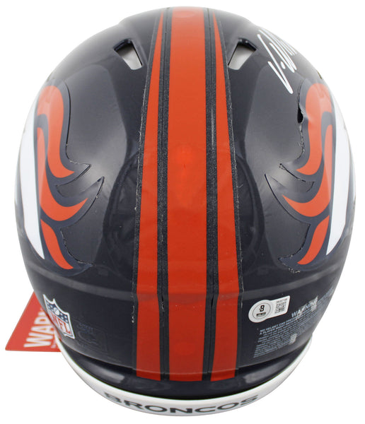 This Autographed Riddell Authentic Full Size Speed Proline Helmet has been Personally Signed by Von Miller of the Denver Broncos. This item is 100% Authentic to include a hologram by Beckett Authentication Services. This item will come with an affixed Beckett Authentication Services (BAS) authentication sticker, which includes a scannable QR code to verify authenticity. Please note that Beckett no longer provides serial-numbered COA cards, and the attached BAS sticker will serve as the complete authentication for this item. This is a BAS Witnessed Protection Program item which means a Beckett Authentication Service representative was present when this item was being signed. We conducted an autograph signing with Von Miller where multiples of the same item were signed. While the photographs are representative of this item, the size, placement and strength of the signature may vary. Each item is hand signed, therefore, each autograph is unique. This item can be verified through BAS Witnessed.