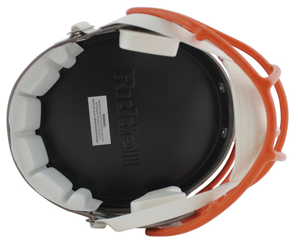 This Autographed Alternate Flash Riddell Full Size Speed Rep Helmet has been Personally Signed by Nick Chubb of the Cleveland Browns. This item is 100% Authentic to include a hologram by Beckett Authentication Services. This item will come with the new Beckett Authentication hologram that has a scannable QR code rather than the traditional COA. If you would like to have a COA, you are welcome to reach out to Beckett for a printed certification once you receive your item. This is a BAS Witnessed Protection Program item which means a Beckett Authentication Service representative was present when this item was being signed. We conducted an autograph signing with Nick Chubb where multiples of the same item were signed. While the photographs are representative of this item, the size, placement and strength of the signature may vary. Each item is hand signed, therefore, each autograph is unique. This item can be verified through BAS Witnessed.