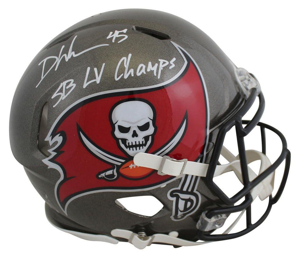 This Autographed Authentic Full Size Speed Proline Helmet with the inscription of "SB LV Champs" has been Personally Signed by Devin White of the Tampa Bay Buccaneers. This item is 100% Authentic to include a Certificate of Authenticity (COA) / hologram by Beckett Authentication Services. This is a BAS Witnessed Protection Program item which means a Beckett Authentication Service representative was present when this item was being signed. This is a stock item. We conducted an autograph signing with Devin White and we have several of these available. The one you will receive will be of equal quality to the one pictured. This item can be verified through BAS Witnessed.