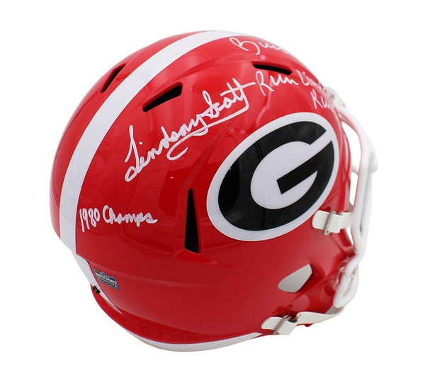 A Georgia Bulldogs Speed Replica NCAA Helmet hand signed by Buck Belue and Lindsay Scott. The item and signature are in excellent condition. In addition to signing their names, Belue and Scott also inscribed "1980 Champs and Run Lindsey Run" on the item. Belue was the starting quarterback for the Georgia Bulldogs from 1978-1981. Scott is a former wide receiver for the Bulldogs. AUTHENTICATION: Your item has been tagged with a SmarTag powered by Prova Technology, which gives you digital access to your items authentication records