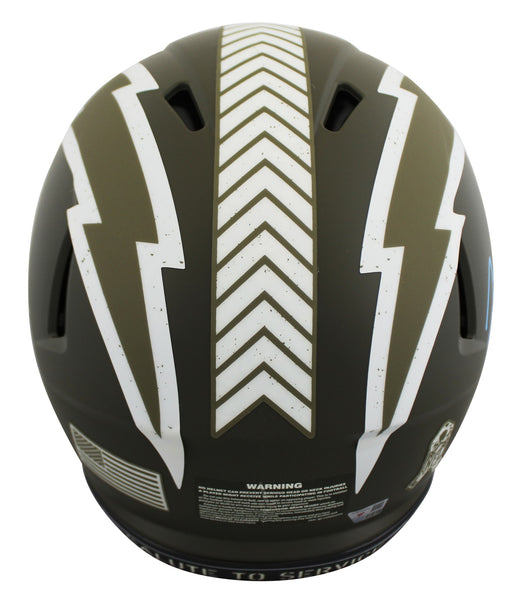 This Autographed Alternate Salute to Service Authentic Full Size Speed Proline Helmet has been Personally Signed by Justin Herbert of the Los Angeles Chargers. This item is 100% Authentic to includes a numbered hologram by Fanatics. We conducted an autograph signing with Justin Herbert where multiples of the same item were signed. While the photographs are representative of this item, the size, placement and strength of the signature may vary. Each item is hand signed, therefore, each autograph is unique. This item can be verified through Fanatics.