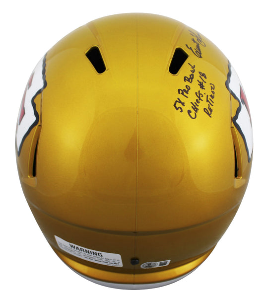 This Autographed Alternate Flash Riddell Full Size Speed Rep Helmet W/ Uv Mirrored Back Acrylic Display Case with the inscription of "HOF 08, SB IV Champ, 5x Pro Bowl, Chief #18 Retired" has been Personally Signed by Emmitt Thomas of the Kansas City Chiefs. This item is 100% Authentic to include a hologram by Beckett Authentication Services. This item will come with an affixed Beckett Authentication Services (BAS) authentication sticker, which includes a scannable QR code to verify authenticity. Please note that Beckett no longer provides serial-numbered COA cards, and the attached BAS sticker will serve as the complete authentication for this item. This is a BAS Witnessed Protection Program item which means a Beckett Authentication Service representative was present when this item was being signed. We conducted an autograph signing with Emmitt Thomas where multiples of the same item were signed. While the photographs are representative of this item, the size, placement and strength of the signature may vary. Each item is hand signed, therefore, each autograph is unique. This item can be verified through BAS Witnessed.