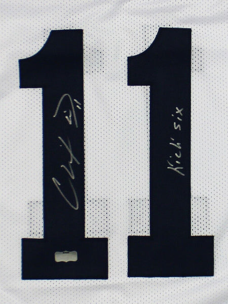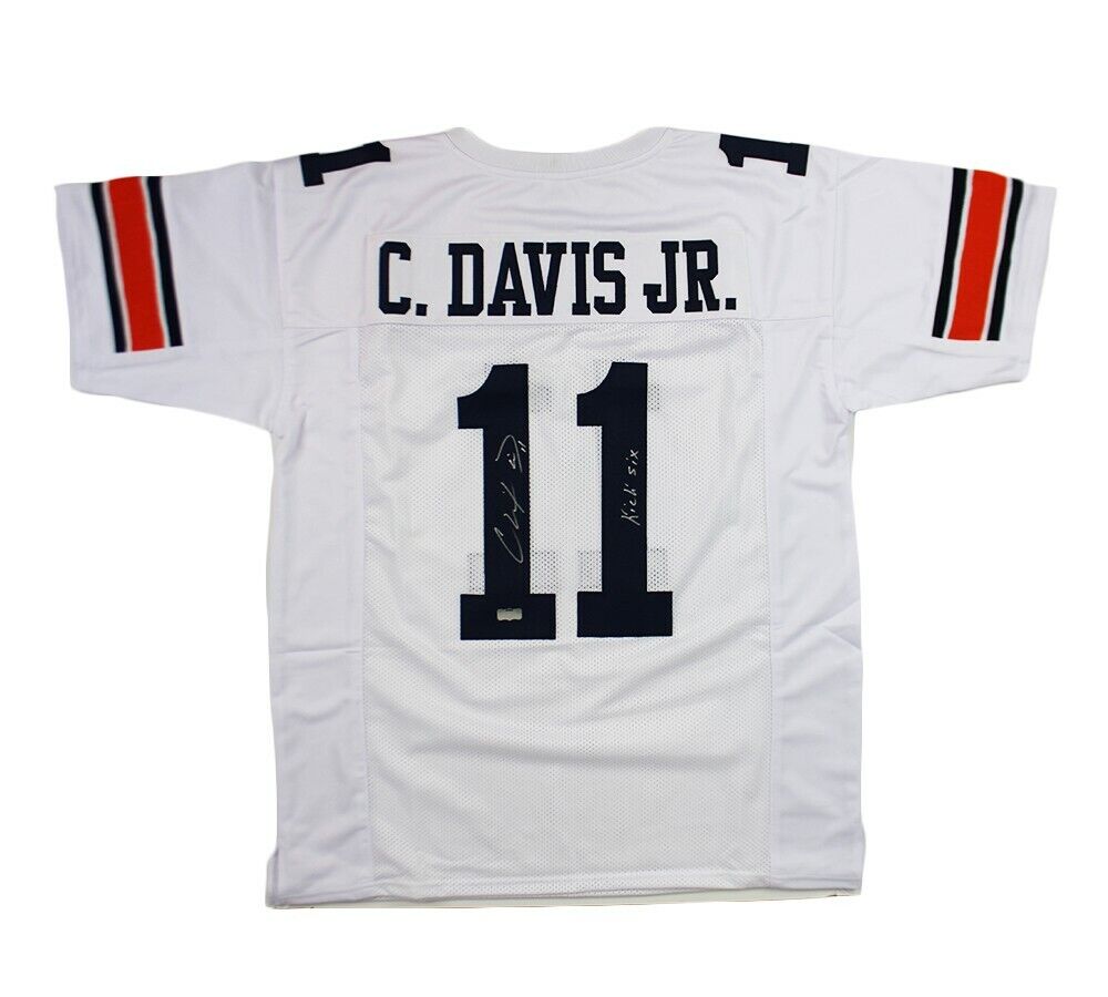 An Auburn Custom White Jersey hand signed by Chris Davis Jr. The item and signature are in excellent condition. In addition to signing his name, Chris also inscribed "Kick Six" on the item. Chris was BCS National Champion, and he is a Second-team All-SEC. Chris is a First-team All-American, and he received the 2011 Chick-fil-A Bowl MVP title. AUTHENTICATION: The item is accompanied by a Certificate of Authenticity - Serial Numbered and Databased Hologram - Picture of Chris from the signing