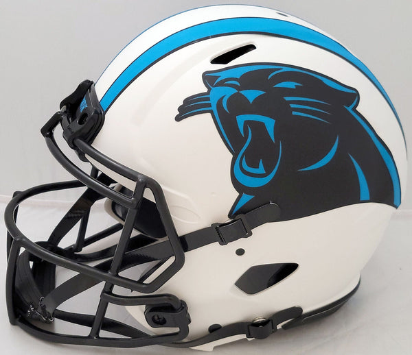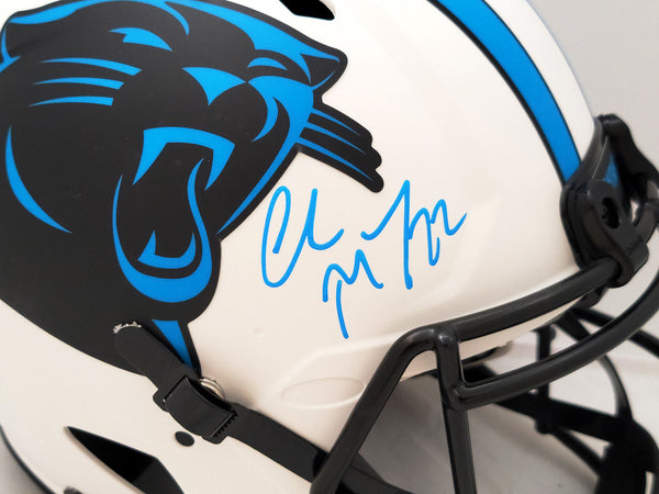 This is a Carolina Panthers Lunar Eclipse White Full Size Authentic Speed Helmet that has been hand signed by Christian McCaffrey. The Eclipse helmets are delicate and may have some marks or scratches on them. This item has been certified authentic by Beckett Authentication (BAS) and comes with their tamper-proof QR Code sticker that can be verified on the Beckett-authentication.com.