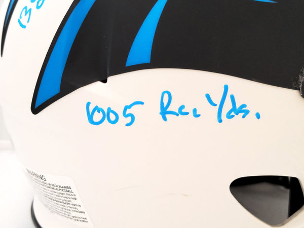 This is a Carolina Panthers Lunar Eclipse White Full Size Authentic Speed Helmet that has been hand signed by Christian McCaffrey. The Eclipse helmets are delicate and may have some marks or scratches on them. This item was inscribed "1387 Rush Yards, 1005 Rec Yards." This item has been certified authentic by Beckett Authentication (BAS) and comes with their tamper-proof QR Code sticker that can be verified on the Beckett-authentication.com.