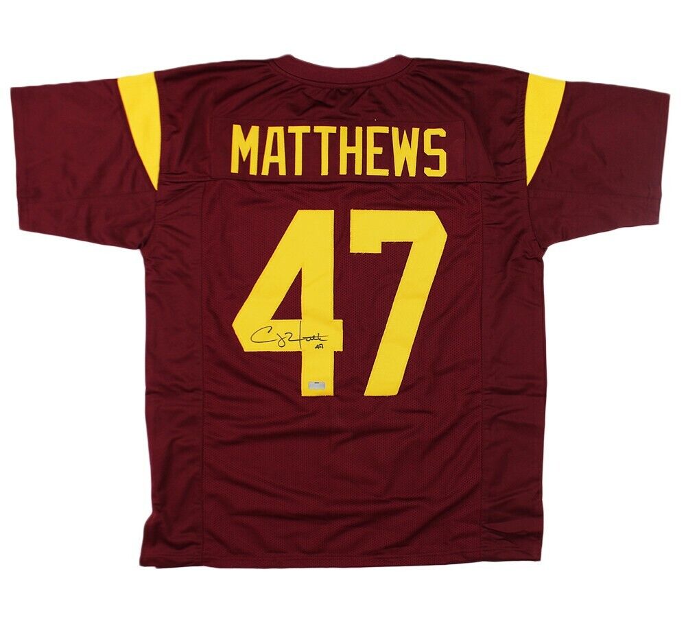 A USC Custom Maroon Jersey hand signed by Clay Matthews. The item and signature are in excellent condition. Clay was drafted into the NFL in 2009 Round:1 Pick:26. Clay is Super Bowl Champion (XLV). Clay was First-team All-Pro (2010). Clay a Second-team All-Pro (2012). Clay 6xPro Bowl (2009-2012,2014,2015). Clay was PFWA All-Rookie Team (2009). AUTHENTICATION: The item is accompanied by a Certificate of Authenticity - Serial Numbered and Databased Hologram - Picture of Clay from the signing