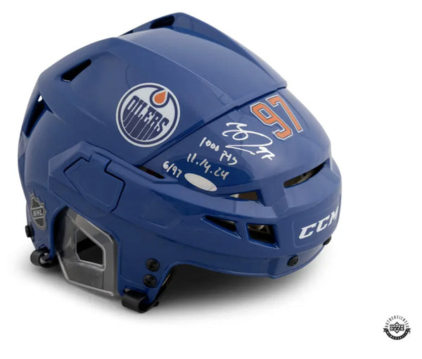 Playing at home at Rogers Place on November 14, 2024, Connor McDavid would score his 1,000th point as part of a 3-2 overtime win for the Oilers over the Nashville Predators. The goal came from a pass on a breakaway from teammate and assistant captain Leon Draisaitl. It wouldn?T take long for McDavid to blow past 1,000 as just two periods later he would get his 1,001st point with a spinning backhand pass for an assist on teammate Darnell Nurse?S game-winning goal in overtime. It only took McDavid 58 games to go from his 900th point to his 1,000th point, becoming the fourth fastest and fourth youngest to reach 1,000 points in NHL history.This full-size CCM HTV08 Edmonton Oilers helmet is autographed and inscribed "1000 PTS 11.14.24" by Connor McDavid. McDavid's signature and inscription were witnessed by an Upper Deck representative as part of UDA's 5-step authentication process. This item is limited to 97.Includes tamper-evident hologram to ensure authenticityOfficially licensed This product is guaranteed authentic and includes an Upper Deck Authenticated Certificate of Authenticity and an accompanying tamper-evident Hologram.