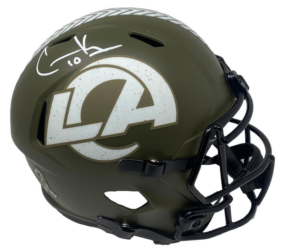 This los angeles rams salute to service full size replica speed helmet has been personally hand-signed by cooper kupp. it is officially licensed by the national football league and comes with an individually numbered, tamper-evident hologram from fanatics authentic. to ensure authenticity, the hologram can be reviewed online. this process helps to ensure that the product purchased is authentic and eliminates any possibility of duplication or fraud.the autograph includes an official fanatics hologram and matching coa for authenticity purposes.comes with a tamper-evident hologram from fanatics authenticatedofficially licensed by the nfl money back guarantee! if for any reason you are not completely satisfied with the quality or authenticity of your purchase, we will gladly give you a full refund or exchange, whichever you prefer up to 30 days after purchase. please feel free to e-mail us with any questions. good luck bidding!!! authenticator pre-certified authenticator: fanatics authenticated history of item: cooper kupp has signed this item in the presence of a representative from fanatics. describe how you came to possess this item: super sports center is a fully authorized dealer for upper deck authenticated as well as mounted memories and steiner sports. other information about you and / or the item: super sports center strives to deliver the most authentic in sports memorabilia from trusted companies like mounted memories, steiner sports and upper deck authenticated. if it exists, we can find it for you!