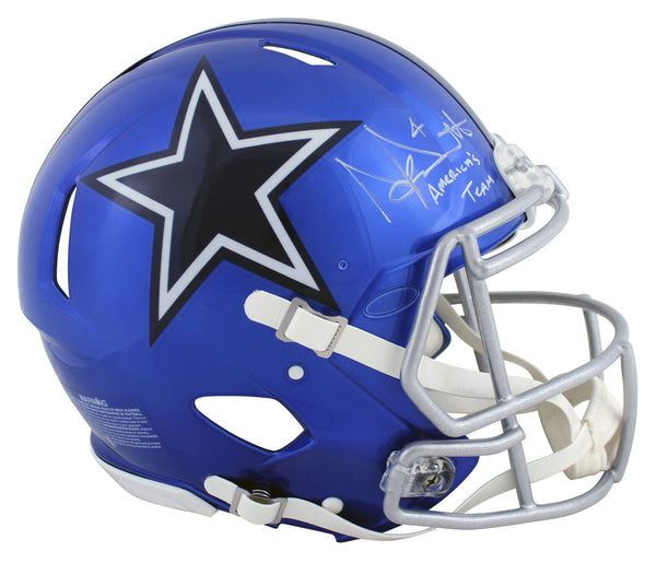 This Autographed Alternate Flash Riddell Authentic Full Size Speed Proline Helmet with the inscription of "America's Team" has been Personally Signed by Dak Prescott of the Dallas Cowboys. This item is 100% Authentic to include a hologram by Beckett Authentication Services. This item will come with the new Beckett Authentication hologram that has a scannable QR code rather than the traditional COA. If you would like to have a COA, you are welcome to reach out to Beckett for a printed certification once you receive your item. This is a BAS Witnessed Protection Program item which means a Beckett Authentication Service representative was present when this item was being signed. We conducted an autograph signing with Dak Prescott where multiples of the same item were signed. While the photographs are representative of this item, the size, placement and strength of the signature may vary. Each item is hand signed, therefore, each autograph is unique. This item can be verified through BAS Witnessed.