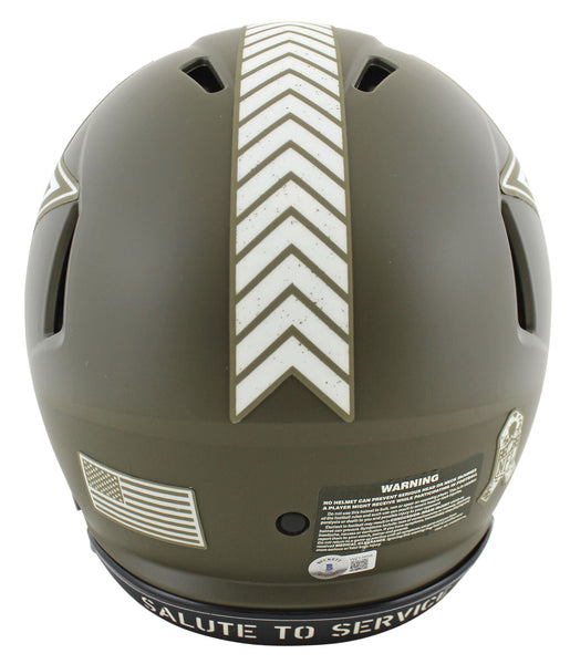 This Autographed Alternate Salute To Service Riddell Authentic Full Size Speed Proline Helmet with the inscription of "America's Team" has been Personally Signed by Dak Prescott of the Dallas Cowboys. This item is 100% Authentic to include a hologram by Beckett Authentication Services. This item may come with the new Beckett Authentication hologram that has a scannable QR code rather than the traditional COA. If you would like to have a COA, you are welcome to reach out to Beckett for a printed certification once you receive your item. This is a BAS Witnessed Protection Program item which means a Beckett Authentication Service representative was present when this item was being signed. We conducted an autograph signing with Dak Prescott where multiples of the same item were signed. While the photographs are representative of this item, the size, placement and strength of the signature may vary. Each item is hand signed, therefore, each autograph is unique. This item can be verified through BAS Witnessed.