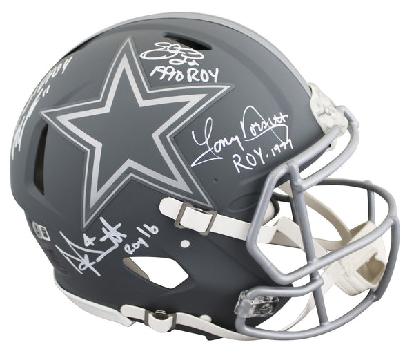 This Autographed Riddell Authentic Full Size Speed Proline Helmet with the inscription of "ROY 2016 (Prescott), ROY 1990 (Smith), ROY 2021 (Parsons), ROY 1977 (Dorsett)" has been Personally Signed by Dak Prescott, Emmitt Smith, Micah Parsons, & Tony Dorsett of the Dallas Cowboys. This item is 100% Authentic to include a hologram by Beckett Authentication Services. This item will come with an affixed Beckett Authentication Services (BAS) authentication sticker, which includes a scannable QR code to verify authenticity. Please note that Beckett no longer provides serial-numbered COA cards, and the attached BAS sticker will serve as the complete authentication for this item. This is a BAS Witnessed Protection Program item which means a Beckett Authentication Service representative was present when this item was being signed. We conducted an autograph signing with Dak Prescott, Emmitt Smith, Micah Parsons, & Tony Dorsett where multiples of the same item were signed. While the photographs are representative of this item, the size, placement and strength of the signature may vary. Each item is hand signed, therefore, each autograph is unique. This item can be verified through BAS Witnessed.