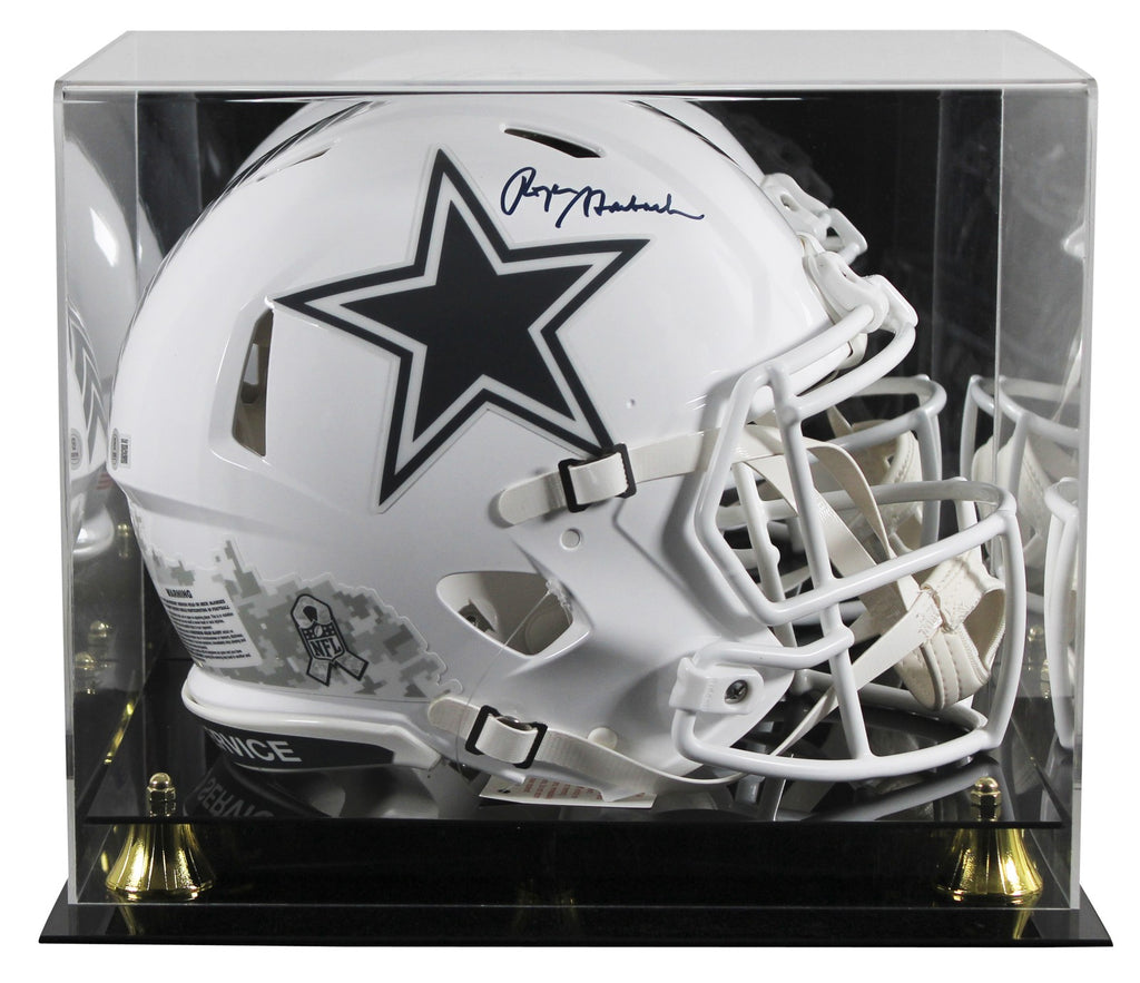 This Autographed Alternate 2024 Salute To Service III Riddell Full Size Speed Proline Helmet W/ Uv Mirrored Back Acrylic Display Case has been Personally Signed by Roger Staubach of the Dallas Cowboys. This item is 100% Authentic to include a hologram by Beckett Authentication Services. This item will come with an affixed Beckett Authentication Services (BAS) authentication sticker, which includes a scannable QR code to verify authenticity. Please note that Beckett no longer provides serial-numbered COA cards, and the attached BAS sticker will serve as the complete authentication for this item. This is a BAS Witnessed Protection Program item which means a Beckett Authentication Service representative was present when this item was being signed. We conducted an autograph signing with Roger Staubach where multiples of the same item were signed. While the photographs are representative of this item, the size, placement and strength of the signature may vary. Each item is hand signed, therefore, each autograph is unique. This item can be verified through BAS Witnessed.