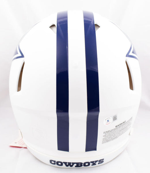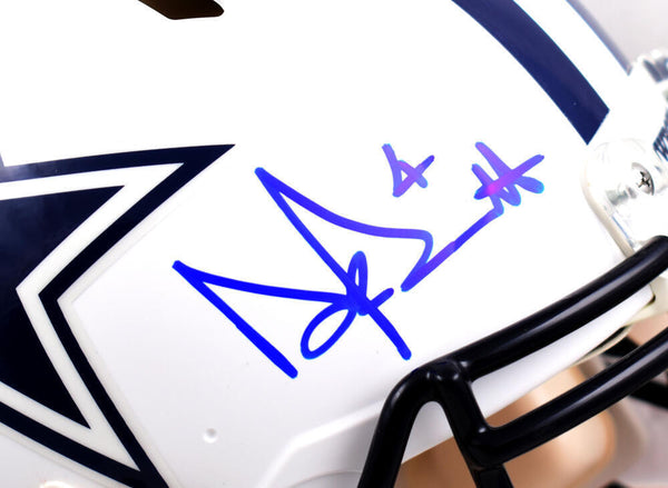 Dak Prescott Autographed Cowboys F/S Flat White Speed Authentic Helmet - Beckett W Hologram *Blue This is a Dak Prescott of the Dallas Cowboys hand autographed Riddell Football Full Size Flat White Speed Authentic Helmet. This item has a Beckett Witnessed Authentication, which comes with a numbered hologram and a QR code for verification. You can view this item on the Beckett Authentication website and it shows when and where the item was signed. It was signed either at a public autograph appearance or a private signing. This is a stock photo of the item. Although you may not receive this exact item, the item you receive is virtually identical, brand new, and in great shape.