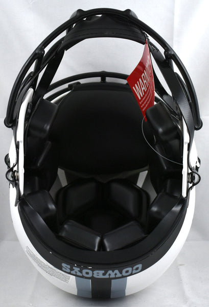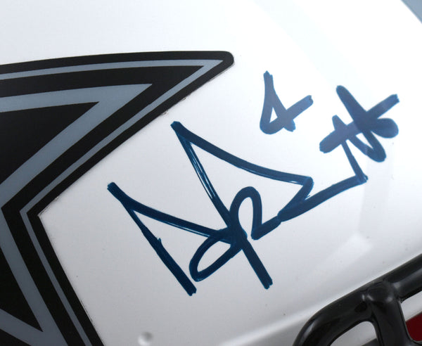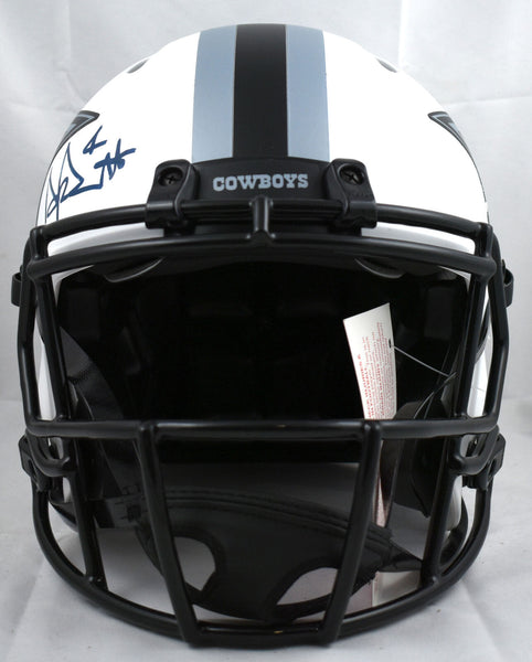 This is a hand autograph of Dak Prescott of the Dallas Cowboys on a Riddell Football Full Size Lunar Speed Authentic Helmet. This item has a Beckett Witness Authentication, which comes with a numbered hologram and a QR code for verification. You can view this item on the Beckett Authentication website and it shows when and where the item was signed. It was signed either at a public autograph appearance or a private signing. This is a stock photo of the item. Although you may not receive this exact item, the item you receive is virtually identical and brand new in great shape. This is a hand autograph of Dak Prescott of the Dallas Cowboys on a Riddell Football Full Size Lunar Speed Authentic Helmet. This item has a Beckett Witness Authentication, which comes with a numbered hologram and a QR code for verification. You can view this item on the Beckett Authentication website and it shows when and where the item was signed. It was signed either at a public autograph appearance or a private signing. This is a stock photo of the item. Although you may not receive this exact item, the item you receive is virtually identical and brand new in great shape.