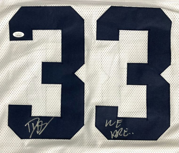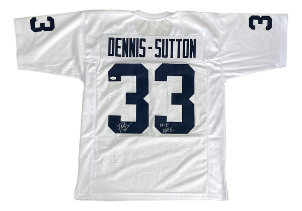 Featured is a Dani Dennis-Sutton signed custom football jersey, inscribed "We Are". This jersey has been hand signed by Dennis-Sutton and comes with the JSA Witnessed hologram and certificate of authenticity. This jersey featured professionally sewn letters and numbers and is size XL. This jersey has no team tags or emblems and is intended as a sports collectible. This jersey would make a great addition to any sports memorabilia collection.. SPECIFICATIONS Autographed By: Dani Dennis-Sutton Team: Penn State Nittany Lions Sport: Football Authentication: James Spence Authentication (JSA)