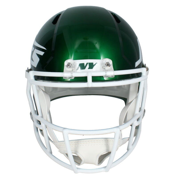This New York Jets full size replica Riddell Speed helmet has been personally hand-signed by Darrelle Revis. It comes with an individually numbered, tamper-evident hologram from Beckett Authentic. To ensure authenticity, the hologram can be reviewed online. This process helps to ensure that the product purchased is authentic and eliminates any possibility of duplication or fraud.