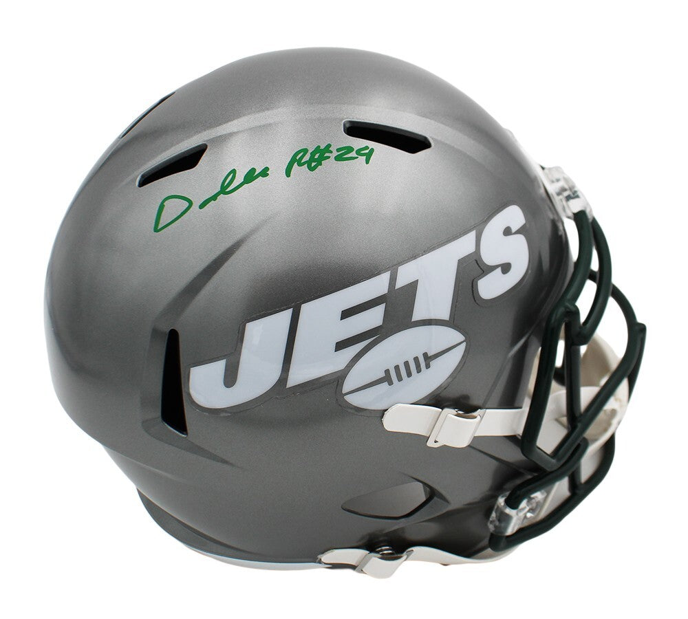 A New York Jets Speed Replica Flash NFL Helmet hand signed by Darrelle Revis. The item and signature are in excellent condition. Darrelle is a former football cornerback for the New York Jets. He is a Super Bowl Champion, 7x Pro Bowler, and received the New York Jets Ring of Honor. AUTHENTICATION: Your item has been tagged with a SmarTag powered by Prova technology, which gives you digital access to your items authentication records, including a proof picture from the signing.