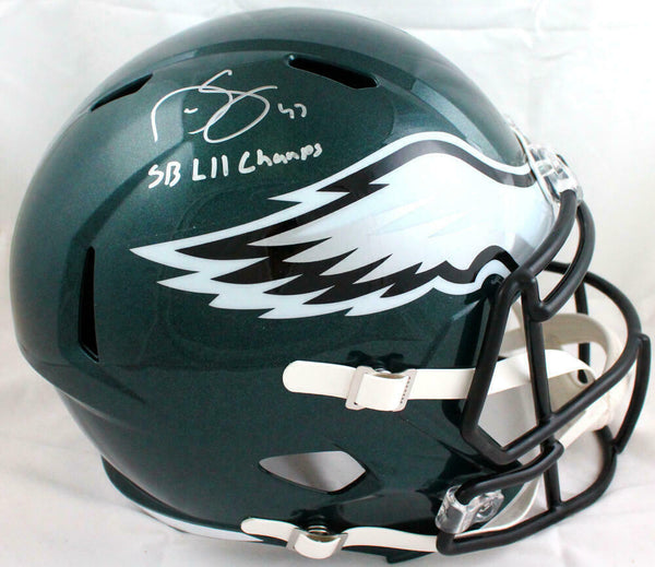 Darren Sproles Autographed Philadelphia Eagles F/S Speed Helmet w/SB Champs-Beckett W Hologram *Silver This is a Hand Autographed Helmet of Darren Sproles of the Philadelphia Eagles on a Riddell Football Full Size Speed Replica Helmet. Inscribed SB Champs. This item has a Beckett Witnessed Authentication, which comes with a Beckett #'ed Sticker Hologram and a QR code for verification. You can view this item on the Beckett website, it shows when and where the item was signed. It was signed either at a public autograph appearance or a private signing. This is a stock photo of the item. Although you may not receive this exact item, the item you receive is virtually identical and brand new in great shape.