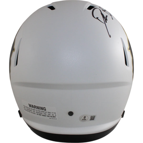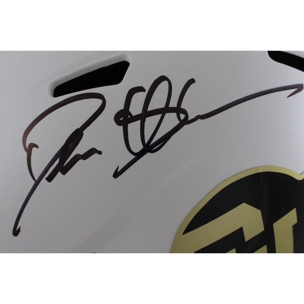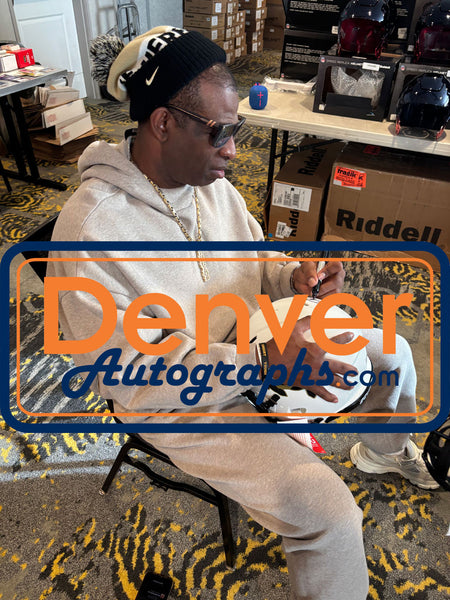 The number in the listing title is just an inventory sku for our records and is not the authentication number. The item pictured is a stock photo unless otherwise noted. This is a University of Colorado Buffaloes Full Size Replica White Speed Helmet that was personally autographed by Deion Sanders. Includes a certificate of authenticity from Beckett Authentication Services (BAS) and Denver Autographs.