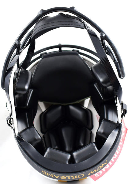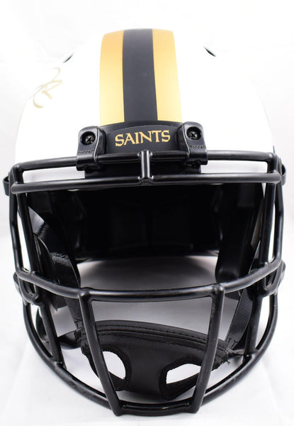 Derek Carr Autographed New Orleans Saints F/S Lunar Speed Authentic Helmet-Beckett W Hologram *Gold This is a Derek Carr of the New Orleans Saints hand autographed Riddell Football Speed Full Size Lunar Speed Authentic Helmet. This item has a Beckett Witnessed Authentication, which comes with a numbered hologram and a QR code for verification. You can view this item on the Beckett website and it shows when and where the item was signed. It was signed either at a public autograph appearance or a private signing. This is a stock photo of the item. Although you may not receive this exact item, the item you receive is virtually identical, brand new, and in great shape.