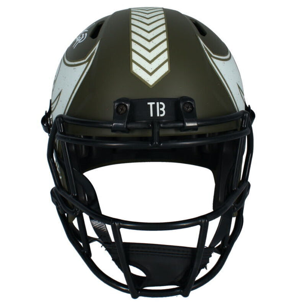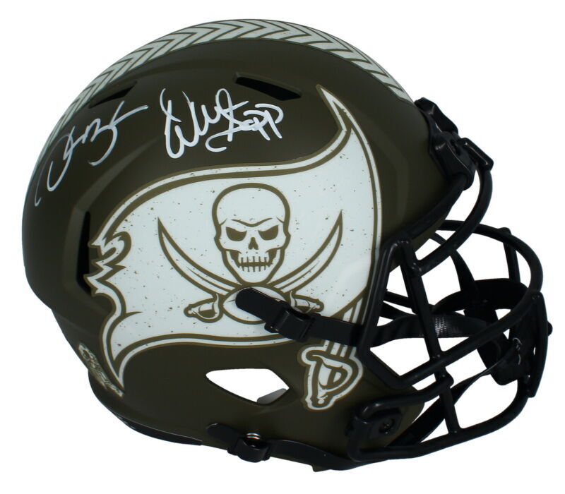 This Tampa Bay Buccaneers full size replica Riddell Salute to Service Speed helmet has been personally hand-signed by Warren Sapp and Derrick Brooks. It comes with an individually numbered, tamper-evident hologram from Beckett Authentic. To ensure authenticity, the hologram can be reviewed online. This process helps to ensure that the product purchased is authentic and eliminates any possibility of duplication or fraud.