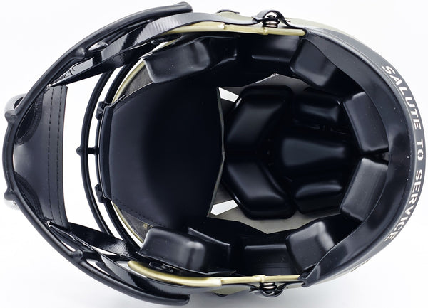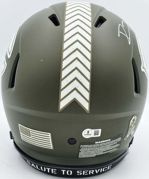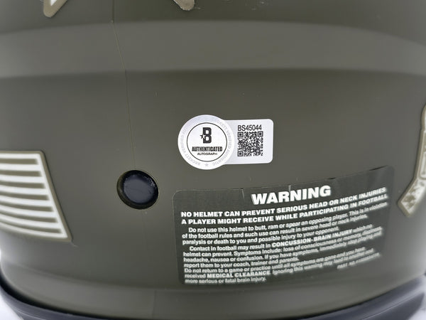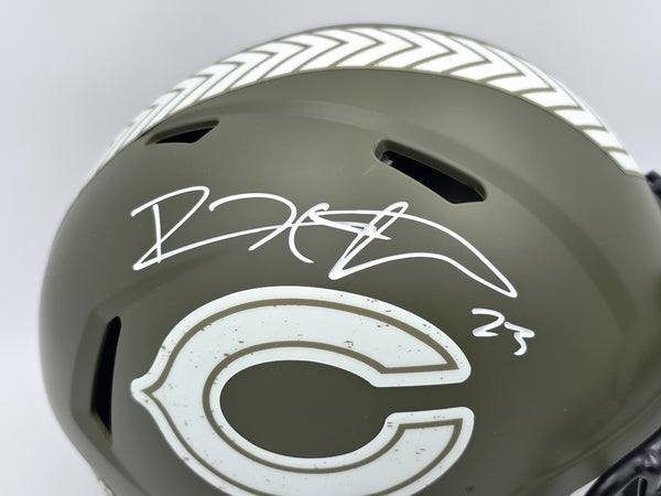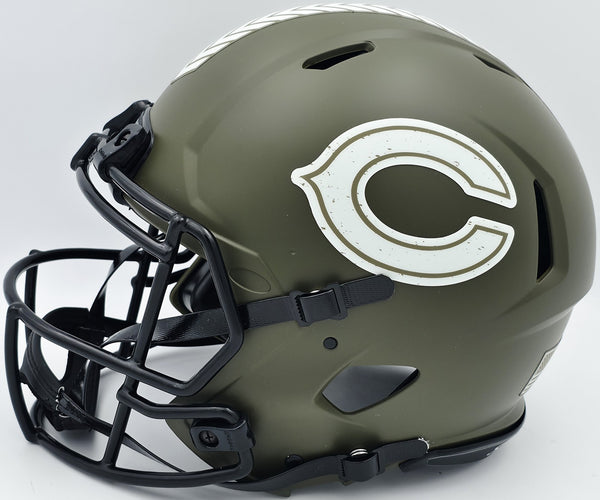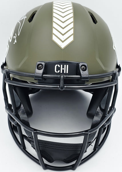 This is a Chicago Bears Army Green Salute To Service Full Size Authentic Speed Helmet that has been hand signed by Devin Hester. This item has been certified authentic by Beckett Authentication (BAS) and comes with their tamper-proof hologram.