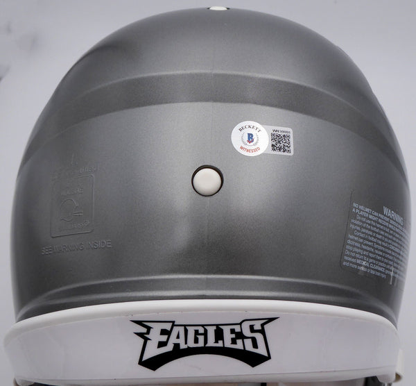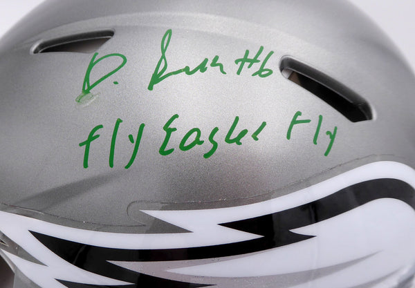 This is a Philadelphia Eagles Flash Silver Full Size Authentic Speed Helmet that has been hand signed by DeVonta Smith. The Flash helmets are very delicate and often have some marks or scratches on them. This item was inscribed "Fly, Eagles, Fly." This item has been certified authentic by Beckett Authentication (BAS) and comes with their tamper-proof QR Code sticker that can be verified on the Beckett-authentication.com.?a NOTE: The autograph is smudged, as shown in the pictures.