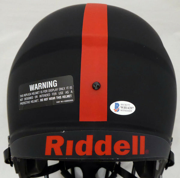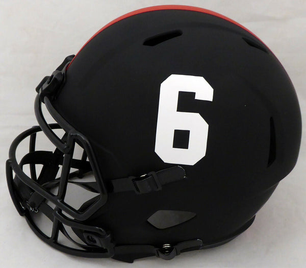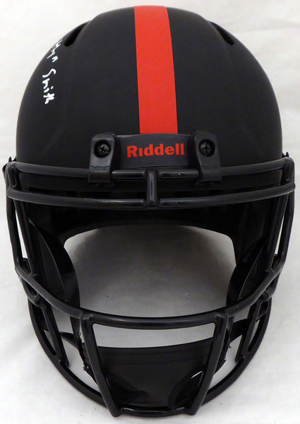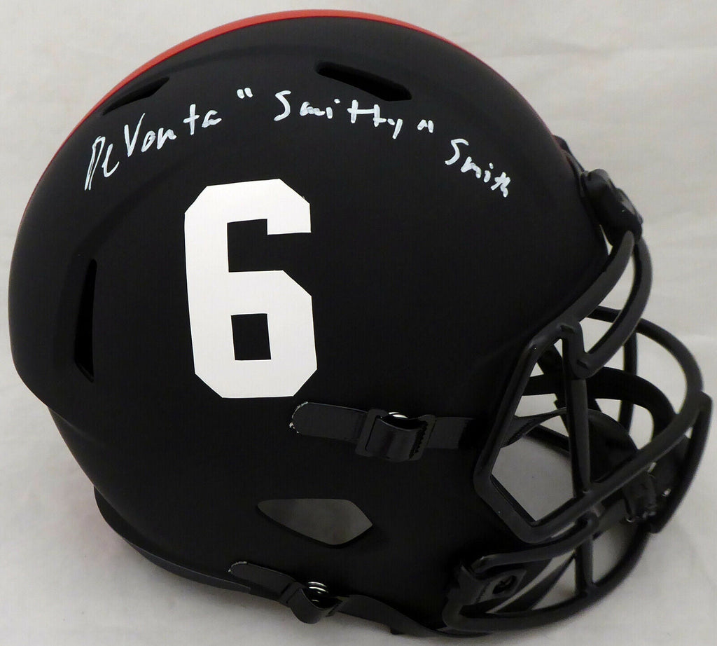 This is an Alabama Crimson Tide Eclipse Black Full Size Replica Speed Helmet that has been hand signed by Devonta Smith. The Eclipse Black helmets are very delicate and often have some marks or scratches on them. This item was inscribed "Smitty." This item has been certified authentic by Beckett Authentication (BAS) and comes with their tamper-proof sticker and matching certificate of authenticity.