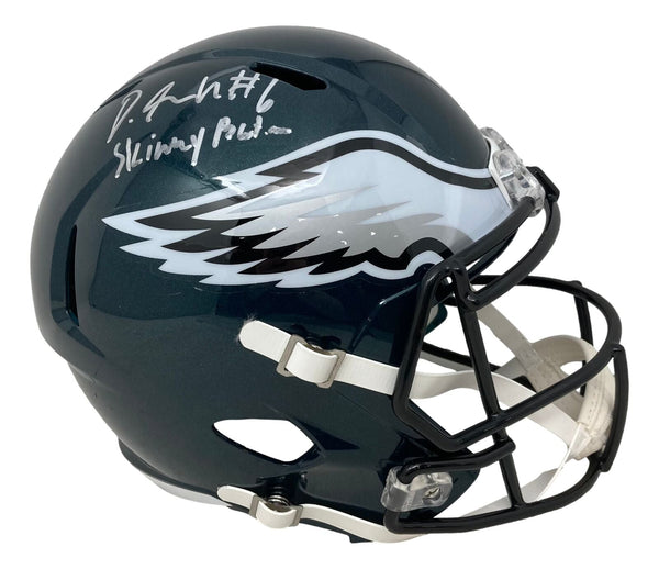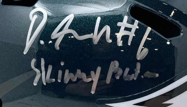 Featured is a Devonta Smith signed Philadelphia Eagles speed replica helmet, inscribed "Skinny Batman". This helmet was hand signed by Smith and comes with the Fanatics hologram and certificate of authenticity.. SPECIFICATIONS Autographed By: Devonta Smith Team: Philadelphia Eagles Sport: Football Authentication: Fanatics Authentic