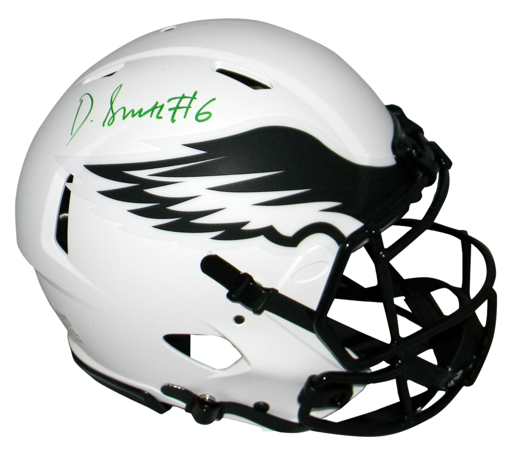 DeVonta Smith, star wide receiver for the Philadelphia Eagles, has hand signed this Eagles Riddell Speed Lunar full-size authentic helmet at a private signing. This helmet is fully padded inside like the ones worn on the field. This item is authenticated by Beckett Authentication Services, one of the best authenticators in the industry. Their tamper-evident hologram featuring a QR code and serial number is on the item. The authenticity can be verified online by entering the serial number or scanning the QR code.Item pictured may not be the exact item you will receive. It will be similar quality, and we guarantee your satisfaction.