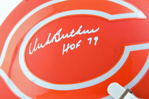 Dick Butkus Autographed Chicago Bears F/S AMP Speed Helmet w/ HOF - JSA W Auth *White This is a hand autograph of Dick Butkus of the Chicago Bears on a Riddell Football Full Size AMP Speed Replica Helmet. This item is inscribed with HOF 79. This item has a James Spence Witness Protection Authentication, which comes with a numbered sticker and a matching JSA Certificate of Authenticity. You can view this item on the SpenceLOA website and it shows when and where the item was signed. It was signed either at a public autograph appearance or a private signing. This is a stock photo of the item. Although you may not receive this exact item, the item you receive is virtually identical and brand new in great shape.
