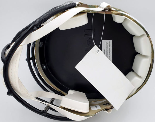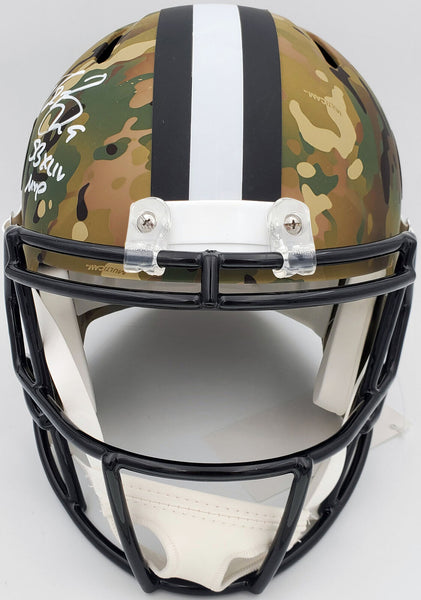 This is a New Orleans Saints Camo Full Size Replica Speed Helmet that has been hand signed by Drew Brees. This item was inscribed "SB XLIV MVP." This item has been certified authentic by Beckett Authentication (BAS) and comes with their tamper-proof sticker and matching certificate of authenticity. NOTE: Because each Camo helmet is hand-dipped using water-transfer technology there may be slight imperfections.